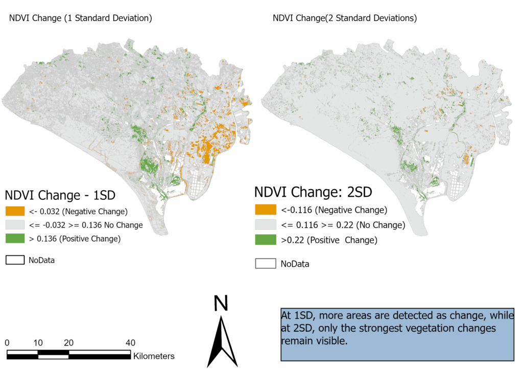 - About 2–11% of the area showed increased greenness, depending on the threshold applied.